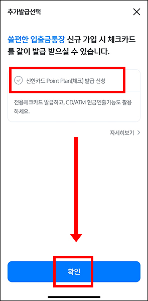 기존에 사용하고 있는 신한은행 계좌번호와 비밀번호를 입력해서 실명확인이 끝나면 추가발급 선택 화면이 나옵니다. 체크카드를 같이 발급받고 싶으면 체크하고 넘어가면 됩니다.