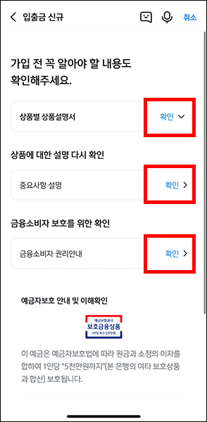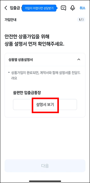 이제 통장 가입안내 화면으로 넘어갑니다. 상품별 상품설명서 보기를 선택합니다. 모든 확인사항을 전부 체크해야 다음으로 넘어갈 수 있습니다.