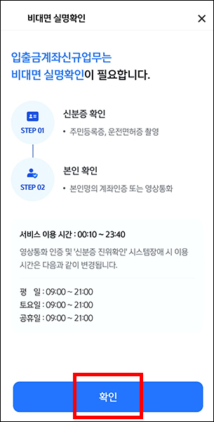 신분증을 촬영하고 나서 사용 중인 계좌로 인증하거나 영상통화를 해서 본인임을 확인받습니다. 계좌인증은 크게 시간제한이 없지만 영상통화는 밤 9시 이후에 할 수 없습니다.
